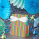 Listras brilhantes em turquesa, limão e rosa decoram esta caixa de lembrancinhas festivas. Esta caixa de lembrancinhas é ótima para um chá de noiva, chá de bebê, festa de aniversário, recepção, etc.... O design é de arte original.