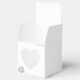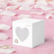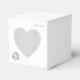 Romântico e clássico, esta caixa de favores quadrada tem uma janela de recorte em forma de coração. Mostrado aqui em Branco. Frente tem um buquê pequeno de rosas moles em um canto e os nomes do novo no canto superior em cor de Ouro. Personalizar ou comprar conforme projetado. Coordenadas com o "Convite para o casamento do templo Vintage Rosa" e com o Convite para Recepção do Templo dos Rosas Vintage". Imagem de ações.