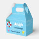 Caixa de favoritos para a festa de aniversário do mesmo design que convite, cartões de agradecimentos e outros produtos apresenta o fundo de piscina de água com áreas de natação. #diversão #poolparty #desfrute #waterpool #azul #branca #favorbox #aniversário #maiô #gogglelens #flipflops #sunblock