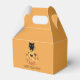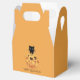 Um gato preto que se esconde atrás de uma caixa de favores de abóboras de girassol de cor d'água para as festas de crianças. Bonito, mas não muito assustador, com uma fonte de estilo esboçada à mão.