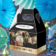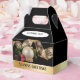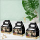 Uma Caixa de Favor de Natal com um toque de elegância. Esta Caixa de Favor de Natal é preta com uma banda de cor dourada, no fundo. No painel da frente e do verso há um ornamento branco com uma cinta verde-esverdeada, uma fita bobinada branca e dourada e pinecones de sotaque, bagas vermelhas e miçangas douradas. O texto da banda dourada diz "Saudações do Seasons" e pode ser personalizado. O painel frontal tem e a área para texto personalizado adicional.