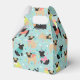 Bela festa de aniversário Pug dog com casacos pretos e bronzeados vestidos de bonitinha de aniversário com balões, bolo e padrão de confete.