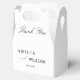 Aprecie seus convidados com esta caixa minimalista de favoritos para casamento — perfeita para segurar doces, presentes pequenos ou notas obrigado-você. Projetada para complementar os casamentos modernos, esta caixa de favoritos apresenta um estilo limpo e elegante com sua escolha de cor de fonte (azul, marrom, preto ou ouro) e uma fita de coordenação para um toque polido. Ideal para temas de casamento azuis ou castanhos, esta caixa adiciona um elemento pessoal e memorável à sua celebração. Use-o para recepções, chás de panela, festas de noivado ou jantadas de ensaio para adicionar um detalhe refinado e coeso à decoração de mesas.