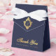 Uma caixa de presente de noivado azul escuro e dourada elegante. Na aba, há um brasão em dourado falso com um monograma a partir de 2 iniciais.