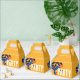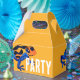 Esta caixa de dobra de festa tropical apresenta o padrão de manchas e listras de um sapo de dart venenoso laranja