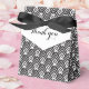 Caixa de presente clássica preta e branca. Diz Obrigado. Ideal para casamentos com tema mono preto e branco, eventos de gala e outras celebrações. Desenhada por Sarah Trett.