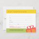 Estes certificados de presentes coloridos colocarão um sorriso no rosto de qualquer um. Várias caixas de presentes dançantes são alegres e apropriadas para qualquer tipo de ocasião de dar presentes. Este modelo facilmente personalizável permite colocar o logotipo de sua empresa na frente e no centro. Basta preencher seu nome comercial, endereço e condições de certificado na parte inferior. Estes cartões-presente personalizados ajudam seus clientes ocupados durante as férias. Ter seu nome e logotipo pré-impresso reforça sua marca comercial. Estes cartões de presente vêm com envelopes brancos.