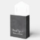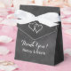 Caixa de favoritos do nó de festa de casamento de quadro de fixação personalizado com texto personalizado para agradecer convidados. Obrigado personalizado que você envia da noiva e do noivo. Impressão de imagem de fundo de quadro negro com tipografia manuscrita na moda. Inclui arco branco elegante de fita. Modelo de texto personalizável. Tendy Vintage design com o duplo coração de amor. Acessórios bonito para casamento, aniversário, noivado feliz ou chá de panela. Esquema de cores preto e branco. Altere a quantidade para obter o preço em massa barato. Caixas de favoritos de forma tenda.