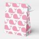 Estas bonitas caixas de estilo de tenda têm um padrão de baleia em uma cor rosada. O flap é um cor-de-rosa coordenador e o texto diz "Âncoras Longe! Uma menina está a caminho! 12 de agosto, 20xx". Personalize estas caixas divertidas com a informação do bebê. Estas são excelentes para festas de chá de fraldas, assim como para anunciar a nova chegada. Eles também trabalham bem para a festa de aniversário de uma garota com um tema de baleia.