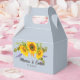 Linda caixa de presente de casamento com um buquê de girassóis em aquarela em um fundo Plein Air (um azul claro) com blocos de texto personalizáveis em fontes modernas