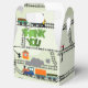 Um labirinto de desenho animado de trilhos de trem com trens, sinais e sinais. O texto "Obrigado" aparece na frente e atrás deste trem e segue a caixa decorada. Perfeito para uma festa de aniversário com o tema do trem! Os teus convidados adorarão levar as suas guloseimas para casa nesta caixa!