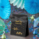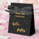 Frente: Elegante e obrigado moderno você prefere uma caixa para a 50ª festa de aniversário. Espanhol preto e texto dourado falso escrito com um script estilo tendencioso com letra manual: olá cinquenta. Com pontos de ouro como decoração. Modelos para um nome, ouro. Com o texto: Obrigado. Traseira: pontos de ouro em um fundo preto.