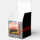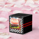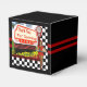 Caixa de favores ao estilo clássico preto quadrado com uma imagem, na frente e no verso, de um cartaz retrorreflector que diz, "Obrigado por vir", um relógio de diner vermelho, e um servidor fêmea de 50 vintage em um tabuleiro de xadrez preto e branco. Duas listras vermelhas rodeiam a caixa. Consulte os convites de cartão correspondente, "Diner Retro 50" e "Sinal de Vazio Retro Diner", envelope, bolsa de favor, etiqueta de favor, etiqueta e adesivos. Veja toda a coleção Nifty 50 Box em TOUCHES ESPECIAIS | Seção Favoritos para festas.