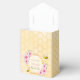 Uma caixa de favor para um Chá de fraldas de verão, celebrando uma menina. Fundo amarelo com um padrão alveolado. Com uma falsa estrutura geométrica dourada. Decorado com flores tropicais cor-de-rosa, hibisco e abelhões felizes sorrindo. Com o texto: Obrigado a você e à mãe por Bee escrito com um moderno estilo escrito à mão. Personalize e adicione o nome da mãe ao nome da abelha e a data do chá. Letras cor-de-rosa, verde e castanho.