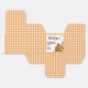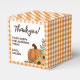 Caixas de lembrancinhas rústicas e adoráveis para o outono, impressas com um padrão xadrez laranja e uma ilustração de uma abobrinha gordinha com girassóis e flores amarelas e verde-menta e raminhos de folhagens com bagas laranja. Agradeça aos convidados no seu chá de bebê de outono, casamento de outono, chá de noiva de outono, festa de aniversário de outono ou qualquer outro evento de outono com tema de abóbora com essas lindas caixas de lembrancinhas com abóboras e girassóis e um toque de charme campestre com o padrão xadrez impresso. O texto é personalizável, então você pode adicionar uma mensagem doce junto com a lembrancinha doce.