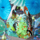 Abstrato em tons vivos de turquesa, lacre, laranja, laranja, vermelho, preto, branco, ouro metálico e tons de verde.
