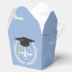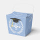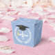 A festa de formatura de direito criativo favorece presentes que apresentam escalas engraçadas de justiça com um boné de formatura preto e dourado sobre fundo azul-claro para o novo advogado.