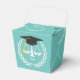 A festa de formatura de direito criativo favorece presentes que apresentam escalas engraçadas de justiça com um boné de formatura preto e dourado sobre fundo azul claro para o novo advogado e seus convidados.