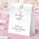 As caixas de lembrança de fechamento de fita estilo tenda do chá de noiva Pérolas & Prosecco apresentam pérolas drapeadas de uma flauta elegante e com seus detalhes em letras elegantes. Itens CORRESPONDENTES em nossa coleção.