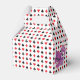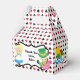 Uma bela caixa de favoritos para a festa de Alice no País das Maravilhas para o aniversário de uma criança. Alice no seu vestido azul e o Mad Hatter sentam-se em cima de um padrão de baralho em vermelho e preto com espadas e símbolos de diamante. Gato legal de cheshire e lagarta de ambos os lados.