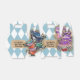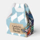 Esta caixa de presentes brancos apresenta um tema colorido da festa de chá par-chá de conto de fadas Alice no País das Maravilhas. Uma imagem do Gato de Cheshire é ilustrada de um lado da caixa, acentuada com um design dourado brilhante. O chapéu de Mad Hatter e uma pilha de equipes são colocados do lado oposto. O fundo apresenta um padrão de harlequin azul pálido.