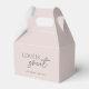 Caixas personalizadas de casamento e chá de panela com tipografia do estilo moderno "amor é doce" sobre fundo cor-de-rosa empoeirado.