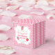 Design da "Primeira Festa de aniversário Berry", de morango doce, apresentando um quadro-colchete com morangos acentuando a frente e um padrão verificado de trás em rosa-morango. Design composto por Designs Holiday Hearts.