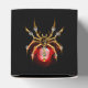 Aranha mecânica, com pá-pá de ouro, engrenagens de latão e uma lâmpada de vidro vermelha sobre fundo preto. Estilo Steampunk.