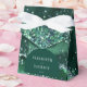 Este design moderno apresenta uma forma escura esmeralda verde em um fundo de aquarela verde agate aparado com falso brilho. Personalize-o com os nomes da noiva e do noivo e a data do casamento em branco.