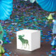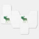 Esta design é o contorno de um alce com um gradiente de cor verde a bege e e a silhueta de um dentro de árvore.