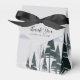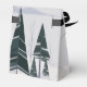 Uma adorável cena de inverno de uma floresta cheia de neve de árvores escuras de abeto e pinheiro e um céu cinza pálido decora esta caixa de lembranças de festa de Natal para um casamento ou gala de Natal. Este desenho moderno de uma paisagem natural nevada é perfeito para um evento numa noite de dezembro ou janeiro.