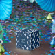 Padrão plano num fundo azul marinho. Excelente para chá de fraldas ou aniversário de criança. Convidado, pratos de papel, guardanapos, lata doce e banner disponíveis.