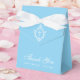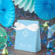 A blue favor box for a boy's christening. On the flap, it has a white crest with a cross in it.