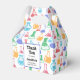 Caixa de pequenos favores com um padrão divertido e colorido. Cientista pesquisador vibe com bicos e frascos de diferentes formas e tamanhos em cores brilhantes e felizes.