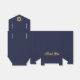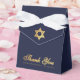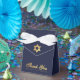 Uma caixa de favor azul marinho e dourado para o bar mitzvah de um menino. Na aba, tem uma estrela de Davi em folha de ouro falso.