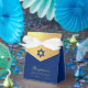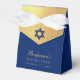 A luxury navy and gold religious bar mitzvah favor box. The flap is faux gold foil and it has a blue star of David on it.