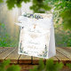 Um fundo branco decorado com verde de eucalipto e folhas de ouro, pó de ouro falso e cruz ouro. Com o texto: Batismo e Obrigado. Personalize e adicione um nome. Sexo neutro.