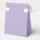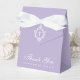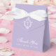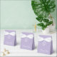 Uma caixa de lembrança de lavanda para um batismo. Na aba, tem uma crista branca com uma cruz no centro.