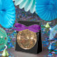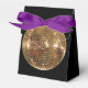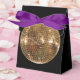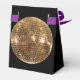 Estilo de tenda preta com uma caixa de favorecimento de fita roxa com uma imagem de uma bola de disco espelhada deslumbrante. Mude a fita para o ouro para uma aparência mais elegante. Veja o convite correspondente, confetti, bolsa de favoritos, etiqueta de favor, etiqueta, adesivo redondo e papel de embalagem. Veja toda a coleção Disco 70s Favor Box em TOUCHES ESPECIAIS | Seção Favoritos para festas.