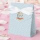 Caixa de favor azul pastel simples com ilustração de uma ave em um ovo verde. Perfeito para presentes de chá de fraldas. Ilustrada e projetada por Patricia Alvarez.