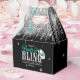 Comece a festa com essas divertidas caixas de lembrancinhas "Disco Bachelorette" em prata brilhante e azul turquesa em um fundo preto. A tipografia atraente "Boots & Bling", o chapéu de cowgirl cintilante são acentuados por uma borda prateada com franjas. Adicione seu nome e data do evento usando o modelo fornecido. Procure ID925 para ver outros produtos da coleção da moda.