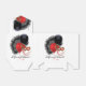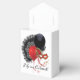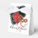 Caixa branca estilo tenda com fita branca com uma imagem de cabaré, na frente e atrás, de um ventilador preto de penas, balão vermelho e preto e uma máscara vermelha. Texto opcional. Sugerimos mudar a fita branca para o cetim vermelho ou preto para um aspecto mais complementar. Veja o convite correspondente, confetti, bolsa de favor, etiqueta de favor, sacos de presentes, adesivo redondo, vinil personalizado e papel de embalagem. Veja toda a coleção da Caixa de Favoritos do Cancan em TOUCHES ESPECIAIS | Seção Favoritos para festas.