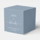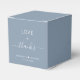 Caixa de favoritos empoeirada de casamento azul que apresenta "amor + obrigados" em uma tipografia branca simples e um roteiro elegante com sucos, seus primeiros nomes se juntaram por um coração e sua data de casamento.