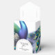 Estas caixas de favoritos de casamento apresentam penas de pavão aquarela em tons de azul real, verde e roxo. As palavras "Obrigado" são definidas na tipografia de tendência. Use os campos modelo para adicionar seus nomes personalizados com data do evento. Para ver todo o tema do casamento visite www.zazzle.com/dotellabelle Arte a aquarela exclusiva e design por Victoria Grigaliunas do Do Tell A Belle.