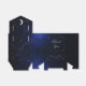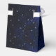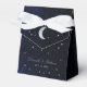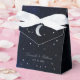 Uma caixa de lembrança de casamento azul dourada para um tema de casamento celestial, com estrelas prateadas em um fundo de céu noturno azul escuro.
