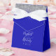 O flape da frente desta elegante caixa de favoritos de casamento moderna apresenta uma borda cintilante de prata. O texto personalizável combina letras brancas e fontes compactas sobre um grande e sobre um fundo azul real.