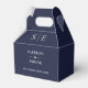 Caixa de lembrança de casamento azul marinho e dourada personalizada com seus nomes, iniciais do monograma e data do casamento. Projetado por Thisisnotme©