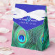Caixas de lembranças de casamento com pavão azul real em azul turquesa elegante e verde esmeralda vibrante. Você pode adicionar texto no estilo de fonte, tamanho e cor de sua escolha nesta linda caixa de lembranças de casamento com pavão azul turquesa.