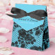 Lindas caixas de favoritos de casamento preto e azul lacrimogêneo. Você pode mudar ou remover o texto, mudar a fita para personalizar esta elegante caixa de favoritos de casamento azul e preto.