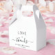Caixa de favoritos de casamento com "amor + obrigados" em uma simples tipografia moderna e um roteiro elegante com sucos, seus primeiros nomes se juntaram por um coração e sua data de casamento.